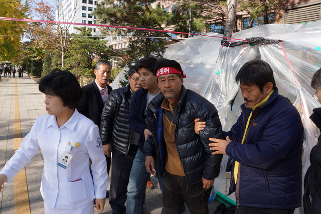 단식 12일째 단식농성중 단체장들 응급실행 병원 단식 중단 권유했으나 단체장들은 단식지속 의지