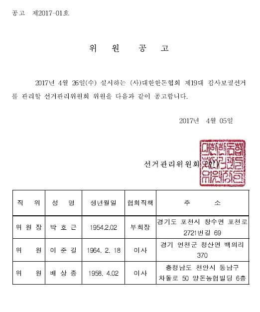 [공고] 제2017-01호 제19대 감사보궐선거 위원공고
