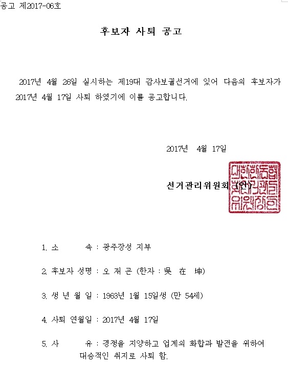 이전게시물 [공고] 제2017-05호 제19대 감사보궐선거 후보자 등록공고
