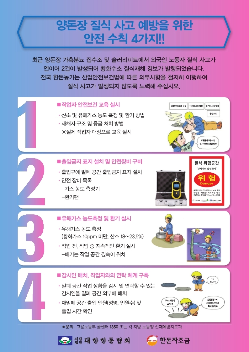 장마와 폭염으로 질식재해 발생위험이 커지는 시기인 만큼 양돈장 밀폐시설 작업 시 질식사고가 발생하지 않도록 한돈농가분들은 각별히 주의하여주시기 바랍니다.