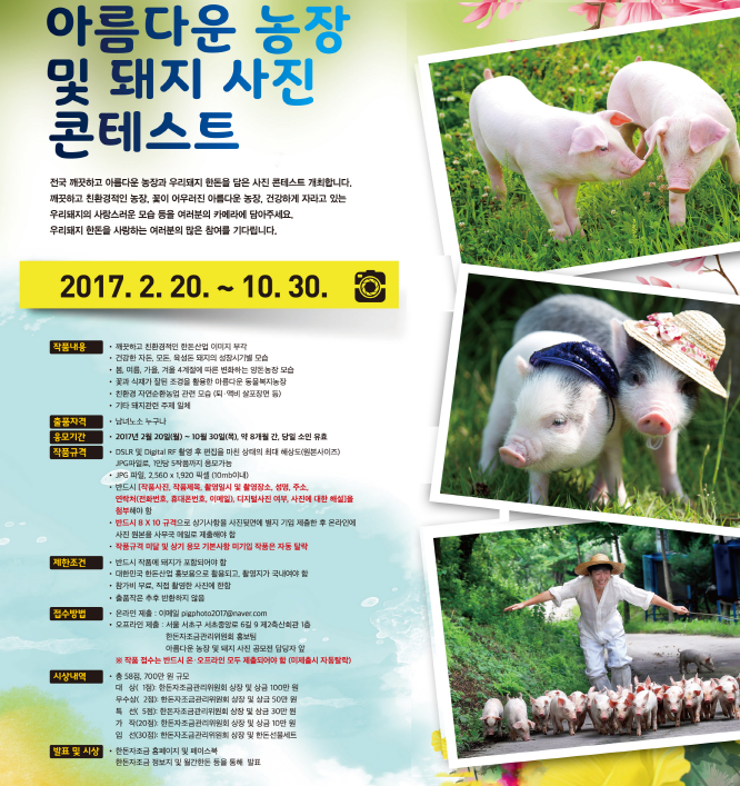 ● 제한조건 - 반드시 작품에 돼지가 포함되어야 함 - 한돈산업 홍보용으로 활용되고, 촬영지고 국내여야 함 - 참가비는 무료이고 직접 촬영한 사진에 한함 - 출품작은 추후 변환하지 않음