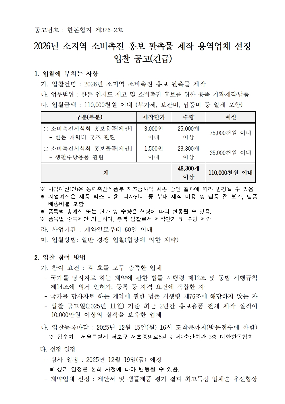 [공고] 2026년 소지역 소비촉진 홍보 판촉물 제작 용역업체 선정 입찰 공고(긴급)
