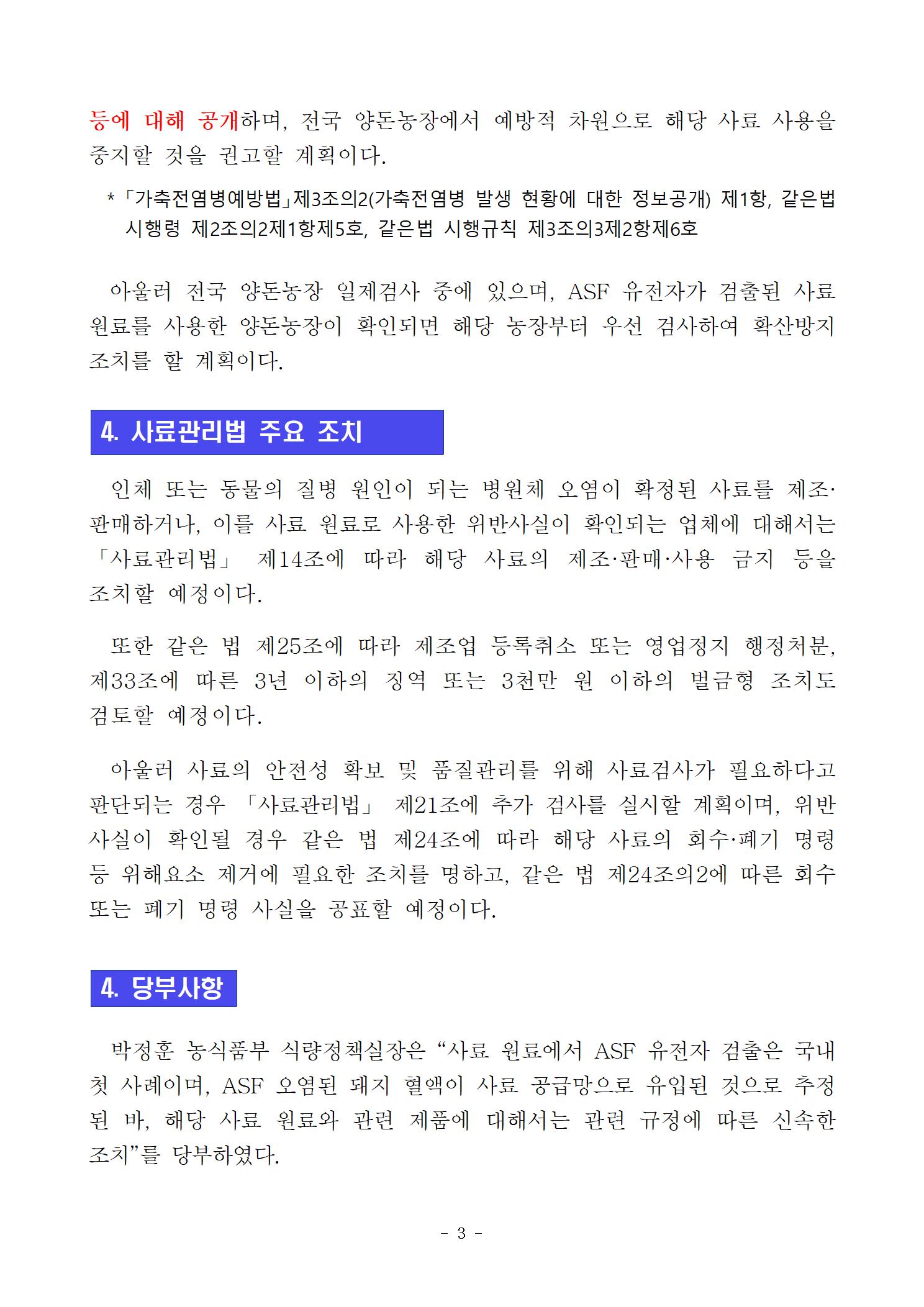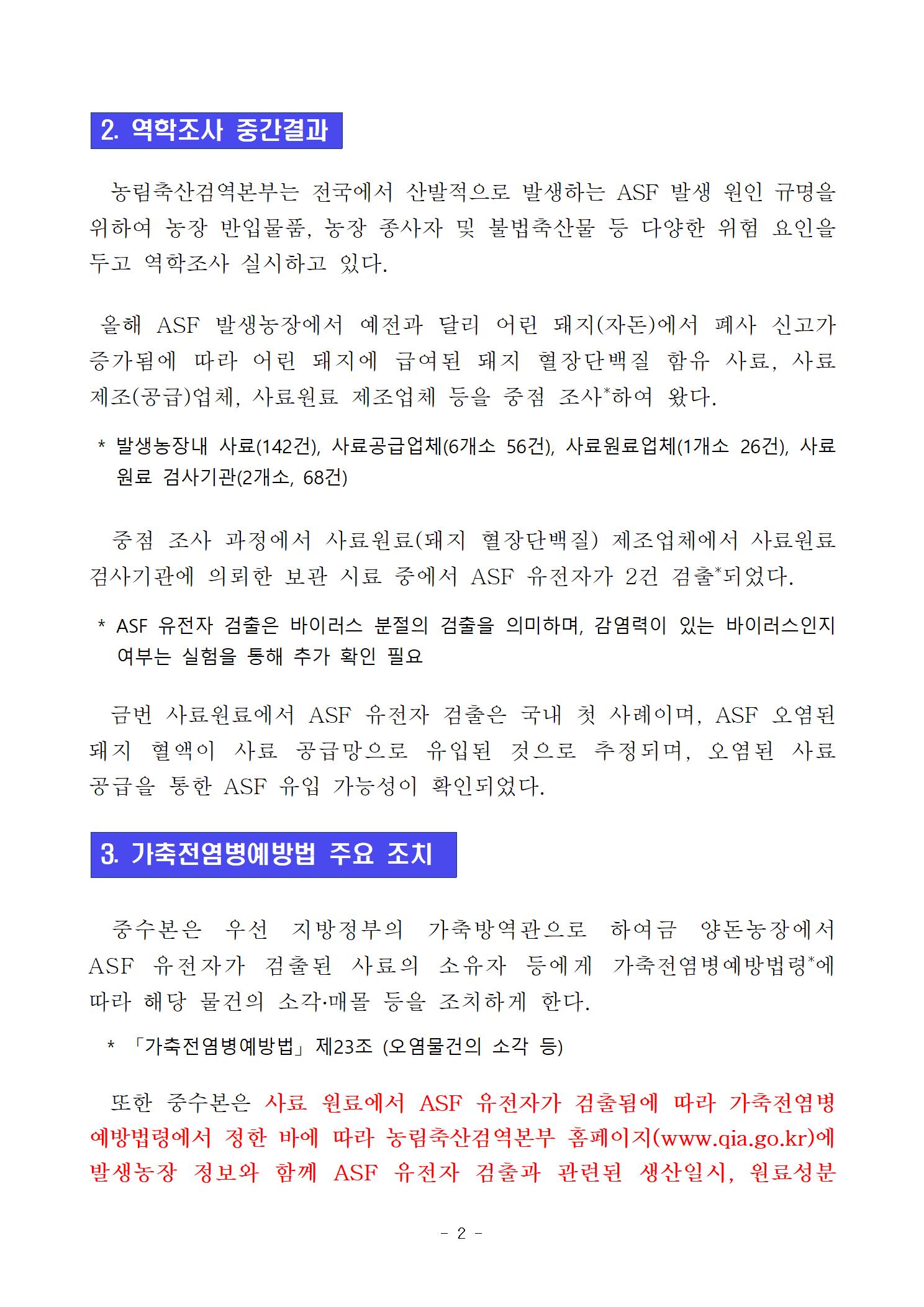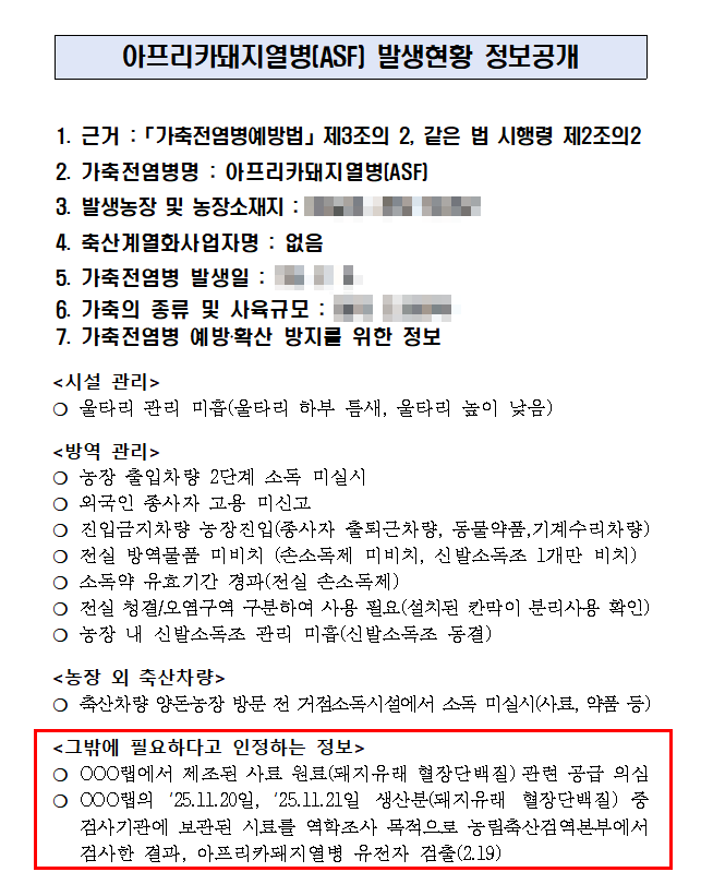 가축전염병예방법령에서 정한 바에 따라 농림축산검역본부 홈페이지(www.qia.go.kr) 발생농장 정보와 함께 ASF 유전자 검출과 관련된 생산일시, 원료성분 등에 대해 공개