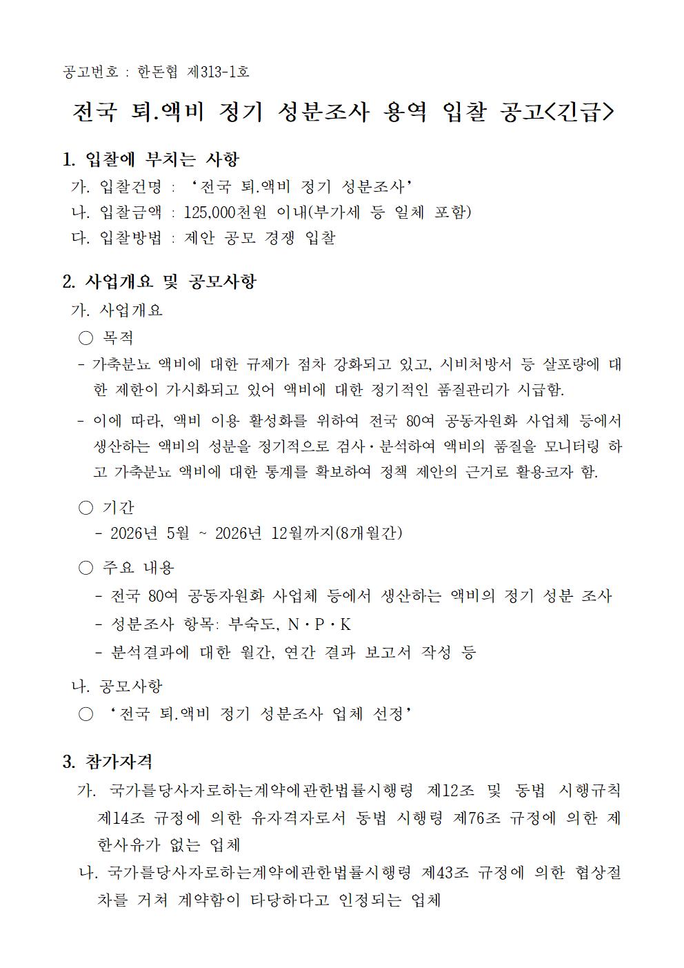 첨부파일 다운로드 313-1(붙임) 전국 퇴.액비 정기 성분조사 입찰 공고.hwp