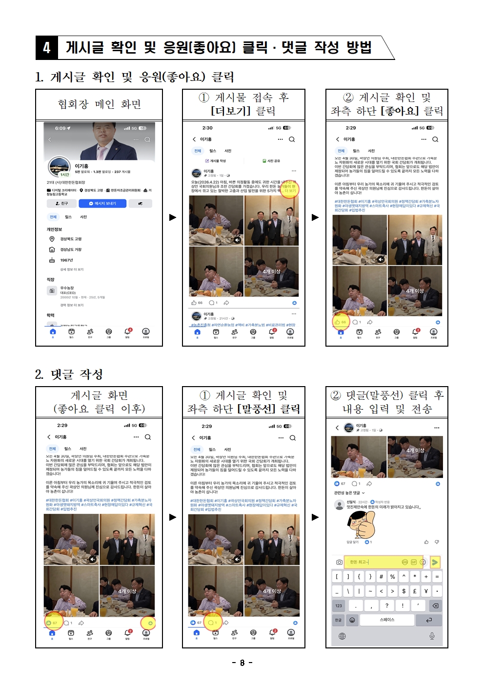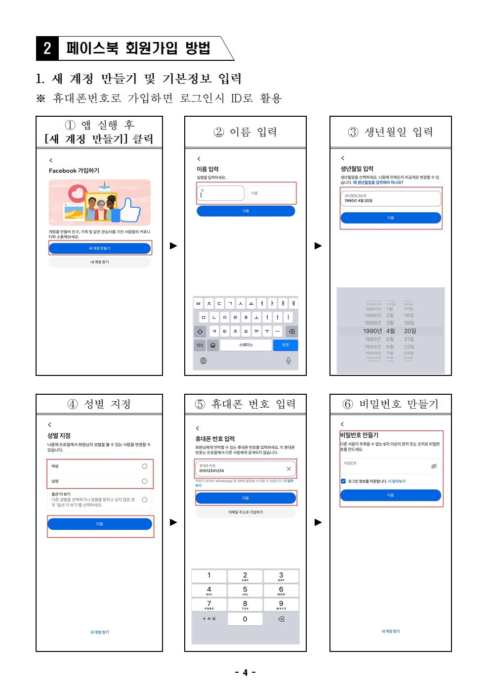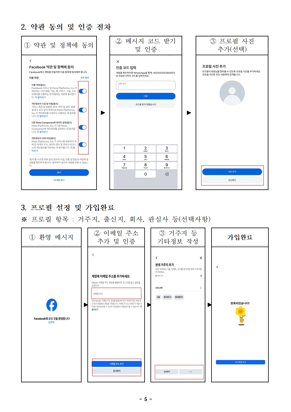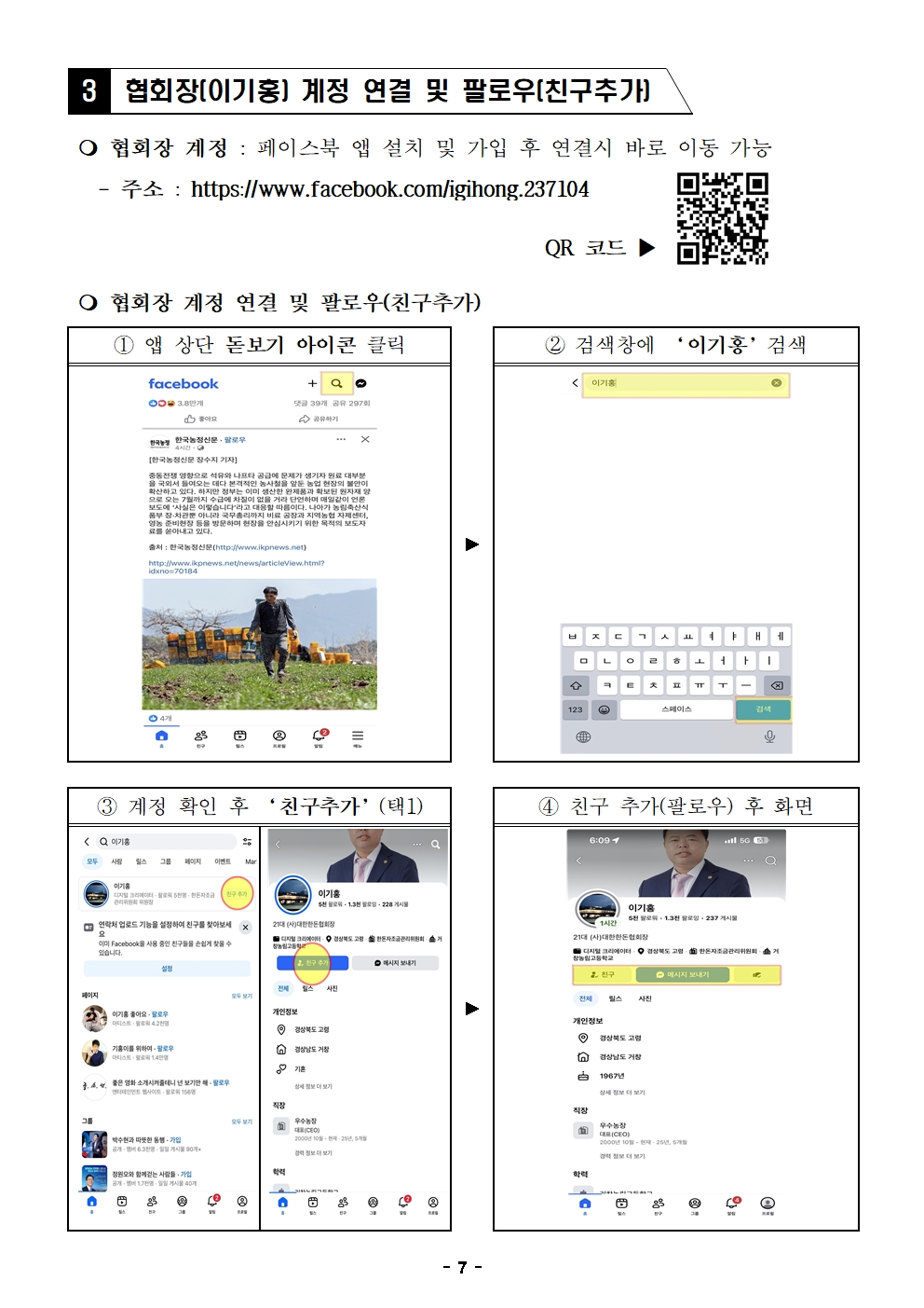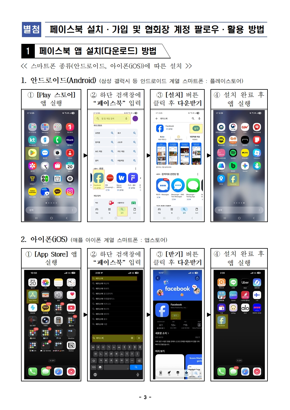 - 방법 : 페이스북 앱 설치 → 회원 가입 → 주소 접속 혹은 QR코드 스캔 사용 시작(팔로우[친구추가], 게시글 응원, 댓글 작성 등)