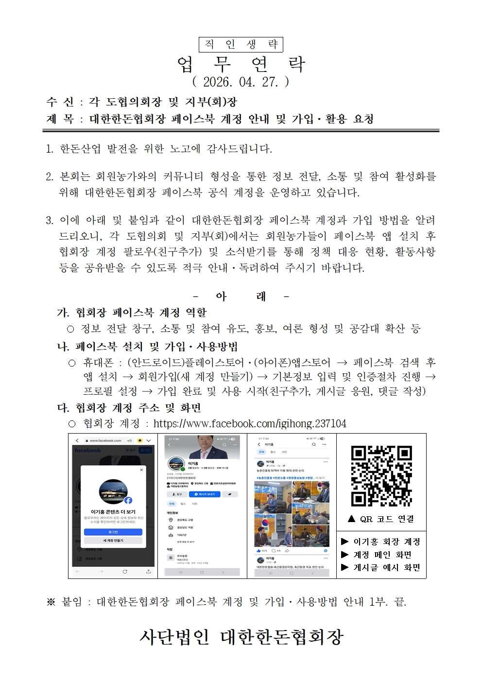 첨부파일 다운로드 (업무연락_260427) 대한한돈협회장 페이스북 계정 안내 및 가입·활용 요청.pdf