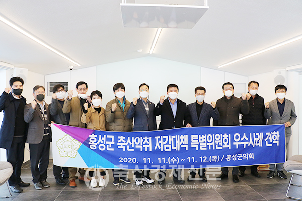 충남 홍성군의회 축산악취 저감대책 특별위원회와 대한한돈협회 관계자들이 우수사례 견학을 기념해 사진 촬영을 하고 있다.
