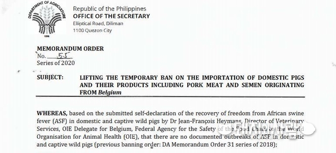 ▲ 필린핀 농업부의 벨기에 돼지고기 및 정액 관련 수입 제한 해제 공문@필리핀 농업부