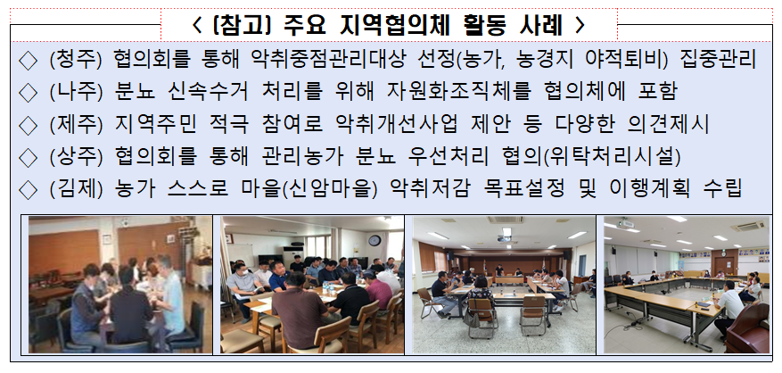 ㅇ 또한, 각 지역에서는 농장․시설주, 지역주민, 생산자단체, 지자체 공무원 등으로 지역협의체를 구성하고, 월 1회 이상 회의 개최 등 지역민 의견수렴 등을 통해 악취개선 성과를 나타내고 있는 것으로 파악됐다.