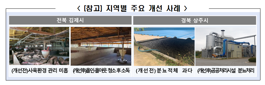 ㅇ (김제시) 악취 민원 지속 지역으로 지역주민의 부정적 이미지가 팽배했던 김제 신암마을은 전체 농가가 악취개선활동에 적극 참여하여 고압세척을 이용한 축사 청소와 주기적인 미생물 사용 등으로 ‘18~’19년 대비 무취일수가 25% 증가하고, 유효악취발생일수가 약 54% 감소*된 것으로 나타났다. * 인근 혁신도시 지역주민으로 구성된 악취모니터단을 통한 지속적인 모니터링 결과(‘20) ㅇ (상주시) 상주의 중소양돈농가(5개소)는 가축분뇨 처리에 어려움을 겪고 악취가 가중되는 상황이었으나, 지역협의체에서 공공처리시설과 소통(반입량 추가 확보)하여 지역 중소농가의 적체분뇨를 인근 공공처리시설에서 처리함으로써 지역의 악취문제가 개선*된 것으로 나타났다. * (상주) 지역주민 23명 대상, 65.2%(15명)가 악취개선된 것으로 응답