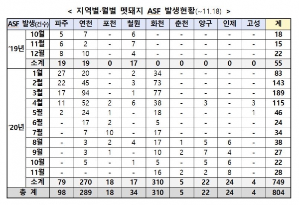 야생 멧돼지 ASF 800건 넘어서 화천 310건, 연천 289건 등 발생 위험 높아 멧돼지 ASF 포상금 100만원서 20만원으로 멧돼지에서 ASF 발생한 지 1년만에 발생 건수가 800건을 넘어섰다. 환경부는 지난 일주일간(11월 12일~18일) 멧돼지 시료 총 230건(폐사체 시료 41건,포획 개체 시료 189건)을 검사한 결과, 강원도 춘천시, 화천군, 양구군, 인제군에서 발견된 폐사체에서 아프리카돼지열병 13건이 추가로 발생해 현재까지 총 804건이 발생했다고 밝혔다. 발생 지역별로 보면 △경기=파주 98건, 연천 289건, 포천 18건 △강원=철원 34건, 화천 310건, 춘천 5건, 양구 22건, 인제 24건, 고성 4건 등이다.