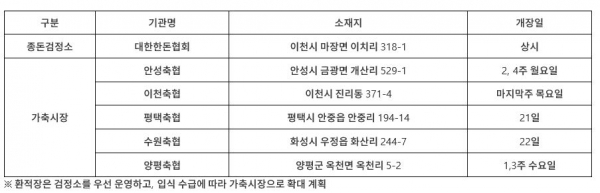 ASF 중앙사고수습본부에 따르면 최근 재입식 평가가 완료된 경기 연천지역 6농가에 대한 재입식이 이번주부터 진행된다고 밝혔다. 이에 재입식 농장들의 안전한 후보돈 공급을 위해 환적장이 운영되며 이곳에서 철저한 방역 관리를 거쳐 해당 농장으로 이동된다. 환적장은 경기 남부 5개(이천, 안성, 평택, 화성, 양평) 시·군에다 지정 환적장 6개소(대한한돈협회 종돈검정소 1, 가축시장 5)가 운영된다.