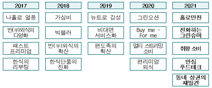 ▲ 최근 5년간 외식 경향(trend)의 핵심어(keyword) 변화@농식품부