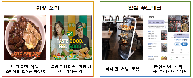 ‘취향 소비’는 ‘80년부터 ’04년생 소비자 중심으로 취향에 따른 체험소비와 구독서비스 이용, 복고풍의 재유행, 이색 식재료 조합과 음식과 패션 브랜드 간 조합 등을 선호하는 경향을 뜻합니다. ‘안심 푸드테크’는 편리한 외식소비와, 위생·안전에 대한 소비자의 관심이 증가하면서 정보통신 기술을 이용한 비대면 예약·주문·배달·결제 등의 서비스 이용이 증가하는 현상을 뜻합니다.