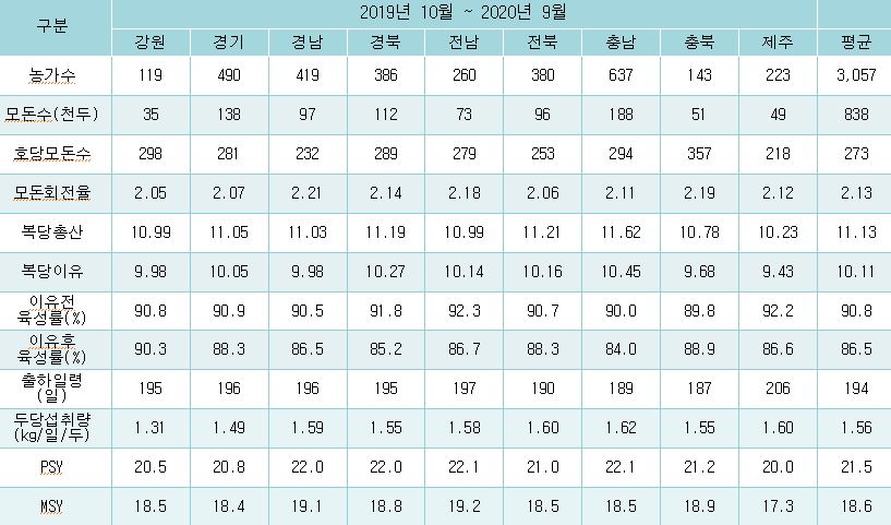 양돈장 성적, 비육서 갈라져 전국 평균 PSY 20두 이상 이유 후 육성률서 '판가름' 최근 전국 양돈장의 총산자수 등 모돈 성적은 상향 평준화됐으나, 비육 성적은 지역별로 큰 차이를 보이고 있다. 한돈팜스가 집계한 지난 1년간(2019년 10월~2020년 9월) 지역별 성적 현황에 따르면 PSY 성적은 전 지역이 20두 이상을 기록했다. 지역별로는 충남과 전남 지역이 22.1두로 가장 높았고 경남과 경북도 22.0두로 그 다음을 차지했다. MSY 성적 또한 제주도를 제외한 전 지역이 18.4두~19.2두 수준의 성적을 보였으며 전남지역이 가장 높은 19.2두였고, 다음으로 경남 지역이 19.1두로 집계됐다. 복당 총산자수도 지역별로 큰 차이는 없으나 대부분의 지역이 11두 대, 강원, 전남, 충북, 제주는 10두 대를 보였다. 그러나 주목할 만한 것은 지역별 이유후 육성율의 차이가 크게 나타났다는 점이다. 강원도는 90.3%로 최고였으나 충남은 84.0%로 가장 낮았다. MSY는 전남이 19.2두로 가장 많았고, 경남이 19.1두, 충북이 18.9두였다. 이에 따라 모돈 성적의 경우 충남은 복당총산자수와 이유두수가 가장 많지만 사고율이 높아서 다산의 이점을 발휘하지 못하고 있다.