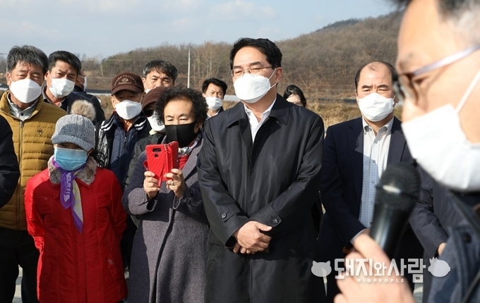 ▲ 권태성 국민권익위원회 부위원장이 27일 충북 음성군 감곡면 고충민원 발생 현장을 방문, 관계자로부터 음성군 가축분뇨공공처리시설 설치 추진 현황에 대해 보고받고 있습니다@국민권익위