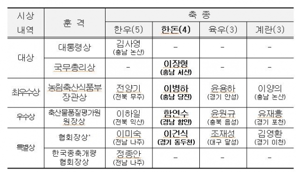 제 18회 전국축산물품질평가대상 수상자 명단 축산물품질평가원은 지난 3일 ‘제18회 전국축산물품질평가대상’ 결과를 발표하고, 이장형씨(충남 서산, 가야농장)를 한돈 부문 대상인 국무총리상에 선정했다. 이장형 농가는 평가 기간 동안 6천136두를 출하해 육질 1+등급 이상 출현율이 56.4%로 나타나 전국 평균 32.8%보다 23.6%p 높았다. 고품질 출하 비결은 균일한 품질의 돼지를 생산하기 위해 개체선별기를 활용해 생체중 111~114kg(거세), 115~118kg(암) 수준으로 전 두수 선별 출하했다. 평균 도체중(88kg)의 표준편차가 전국 6.8kg에 비해 3.3kg이 적은 3.5kg에 불과하여 품질의 표준화를 이뤘다. 이밖에 한돈 부문 수상 농가는 △최우수상(농림축산식품부장관상)=이병하(충남 당진 산수농장) △우수상(축산물품질평가원상)=함연수(경남 함안, 입곡농장) △특별상(한돈협회장상)=이건식(경기 동두천, 개미와 베짱이) 등이 수상했다. 한편 올해는 코로나19 확산에 따라 그동안 축산물품질평가원 본원에서 개최했던 시상식이 취소되었으며 12월 4일부터 상장, 상패 등을 각 농가에 전달될 예정이다. 축산물품질평가원 장승진 원장은 “코로나19 창궐로 인해 시상식을 개최하지 못해 아쉽지만, 수상농가가 우수 축산물 생산에 자부심을 가지도록 본 행사의 품격 향상을 위해 노력하겠다”며 “나아가 축산 선도농가의 우수축산물 생산모델을 통해 국내산 축산물 경쟁력 강화에 기여할 것”이라고 강조했다. [출처 : 양돈타임스 2020. 12. 7.] |