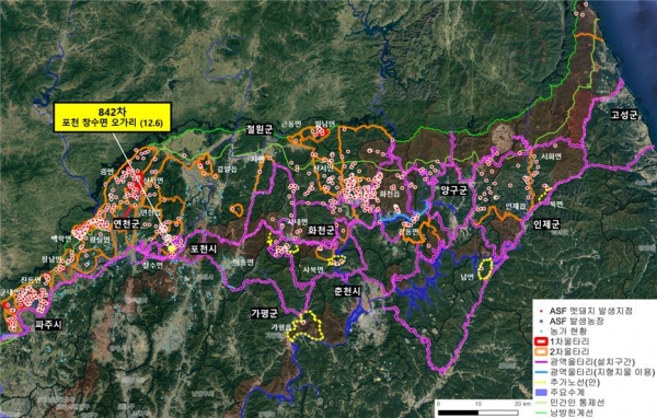 야생멧돼지 발견지점(환경부 제공) [출처 : 양돈타임스 2020. 12. 9.] |