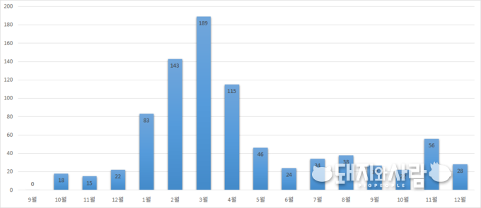 ▲ 월별 야생멧돼지 ASF 발생건수@환경부 자료 편집