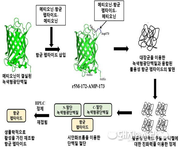 ▲ 대량생산용 벡터(대장균)를 이용한 항균 펩타이드 생산과정 모식도@건국대학교