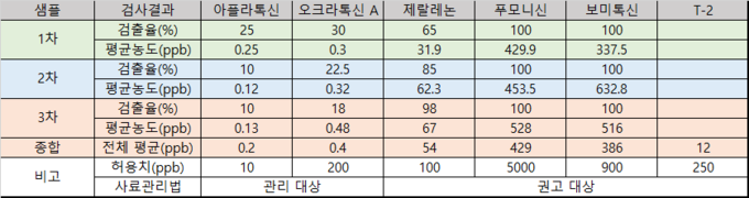 10개 농장 샘플 대상 6종 곰팡이독소 검사 결과 허용 및 권고 수치 이하 일부 샘플은 제랄레논, 보미톡신 권고치 이상 검출