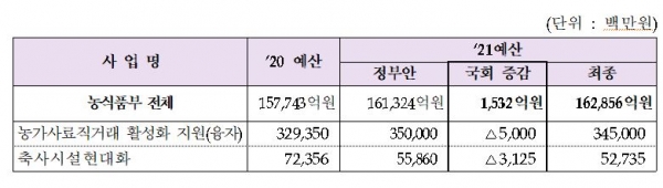 내년 축산시설현대화사업비 준다 정부안보다 31억원 삭감 사료 직거래융자도 감소 총 농축수산 예산 3.2% ↑ 내년도 농림축산식품부 소관 예산이 당초 정부안보다 증액된 가운데 축사시설 현대화 예산은 한번 더 깎였다. 농축산부는 지난 2일 국회 본회의에서 내년도 소관 예산 및 기금 총지출 규모가 16조2천856억원으로 확정됐다고 밝혔다. 이는 정부안 16조1천324억원보다 0.9%(1천532억원) 많고 올해(15조7천743억원) 보다 3.2%(5천113억원) 증액된 규모다. 전체 예산은 다소 늘었지만 이 가운데 축사시설현대화 사업은 사업 실수요를 반영해 정부안인 558억6천만원보다 31억2천500만원이 더 감액된 527억3천500만원으로 확정됐다. 당초 내년 예산도 올해 723억5천600만원보다 준 규모였다. 농가사료직거래 활성화 지원(융자) 사업도 올해(3천293억5천만원)보다는 다소 늘었지만 기존 정부안인 3천500억원에 비해서는 50억원이 준 3천450억원으로 결정됐다. 반면 축산물수급관리 예산은 정부안보다 소폭 증액되면서 올해 873억9천만원보다 소폭 늘어난 889억8천700만원으로 확정됐다.
