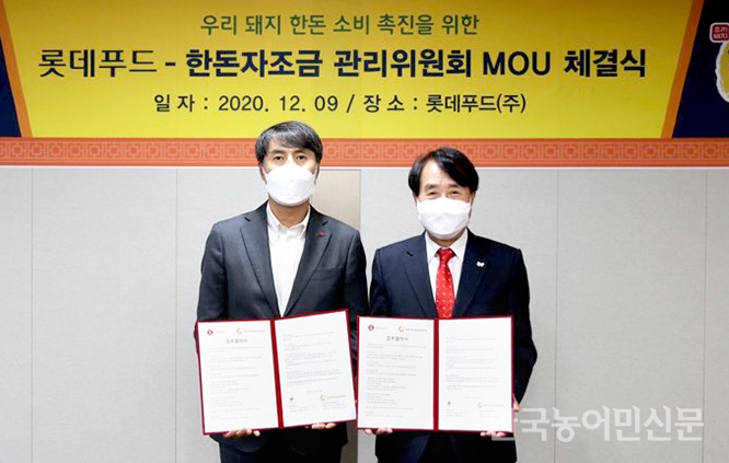 ▲ 한돈자조금이 롯데푸드와 업무협약을 체결했다. [출처: 한국농어민신문 2020. 12. 16.] |
