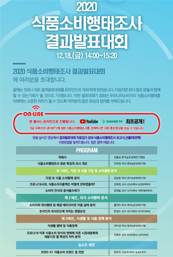 농경연, 2020 식품소비행태조사 결과발표대회 온라인 중계 |