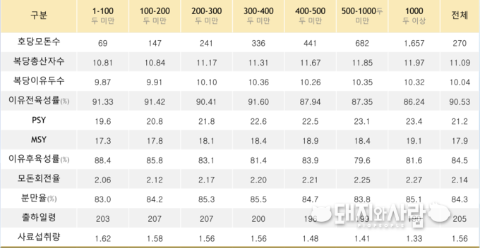 지난해 생산성적을 모돈 규모별로 살펴보면 규모가 클수록 더 좋은 성적을 보이는 양상을 보였습니다. 이에 1000두 이상 농장이 가장 높은 PSY와 MSY를 보였습니다. 각각 23.4두, 19.1두 입니다. 전체 평균보다 2.2두, 1.2두가 더 많습니다. 반면, 100두 미만 농장의 경우 PSY 19.6두, MSY 17.3두로 가장 저조한 성적을 보였는데 복당산자수와 분만율 역시 가장 낮은 결과로 추정됩니다.
