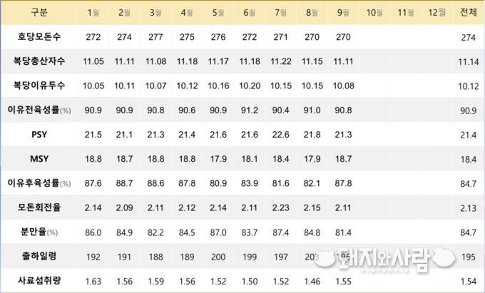 올해(9월 기준) 우리나라 양돈농가의 평균 PSY와 MSY가 각각 21.4두, 18.4두를 기록해 전년에 비해 전반적으로 성적이 개선된 것으로 나타났습니다.