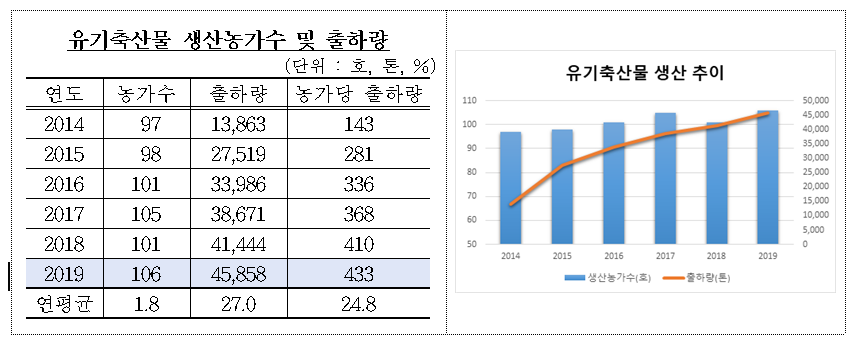 <1> 유기‧무항생제 축산물 생산 현황 □ (유기축산물) ’19년 기준 유기축산물 생산농가수는 106호이며, 최근 5년간 소폭 증가(‘14: 97호 → ’19: 106호, 연평균 1.8%)한 반면, 출하량은 46천톤으로 최근 5년간 큰 폭 증가(‘14: 14천톤 → ’19: 46천톤, 연평균 27%)하였다.