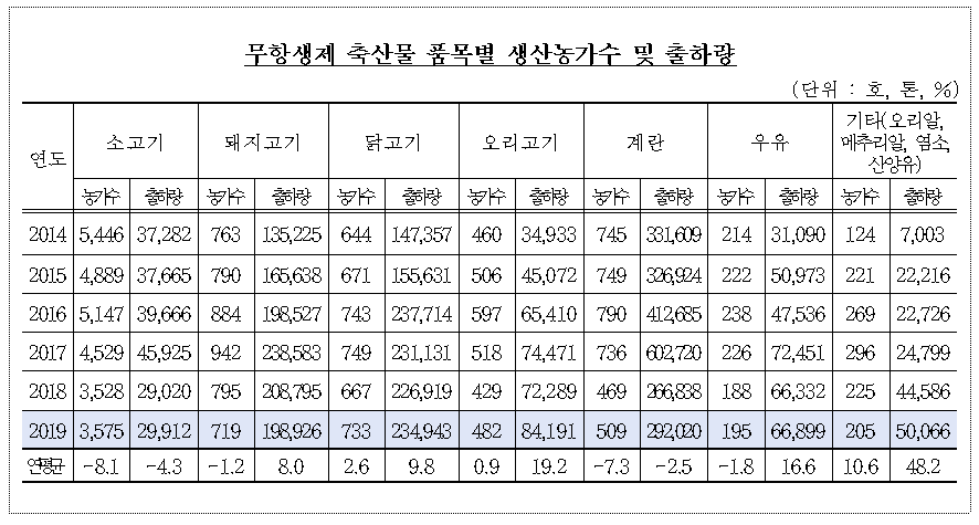 ㅇ 품목별 출하량을 보면, 최근 5년간 닭고기는 연 9.8%, 돼지고기는 연 8.0%, 오리고기는 연 19.2%의 증가율을 나타내는 반면, - 소고기와 계란은 ‘17년 살충제 계란 사건 이후 사육환경 검사기준 강화 등으로 출하량이 감소하였다가 ’19년 다시 증가하고 있다. * 무항생제 소고기 출하량(천톤) : (’17) 46 → (‘18) 29 → (’19) 30 * 무항생제 계란 출하량(천톤) : (’17) 603 → (‘18) 267 → (’19) 292