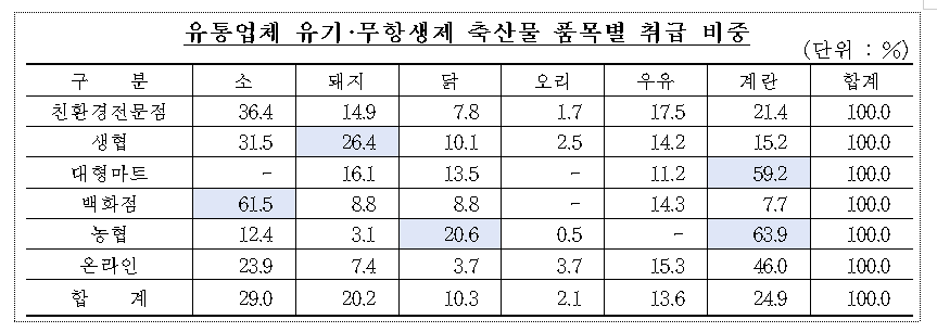 ㅇ 소매 유통업체별 취급품목은 친환경전문점의 경우 소고기와 계란, 생협의 경우 돼지고기와 소고기, 대형마트의 경우 계란과 돼지고기, 백화점의 경우 소고기가 높은 비중을 차지하는 것으로 조사되었다.