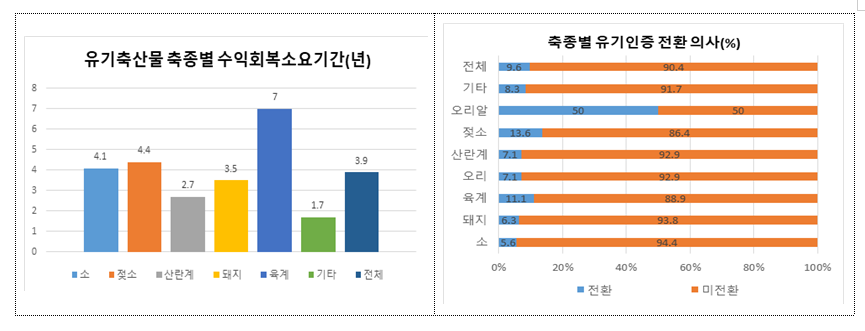 □ (수익 회복기간) 유기축산물 인증을 취득한 후 초기비용 부담을 극복하고, 수익이 회복되는 기간은 평균 3.9년으로 조사되었으며, 축종별로는 육계 7년, 젖소 4.4년, 소 4.1년, 돼지 3.5년 순으로 나타났다. * 유기축산물 생산비는 100% 유기사료 공급, 자가 조사료포 확보 등으로 인해 일반 축산물에 비해 20〜70% 높은 것으로 조사 □ (유기 전환 의사 등) 무항생제 인증농가의 9.6% 정도가 유기 인증 전환의사를 밝혔으며, 축종별로는 오리알 50.0%, 젖소 13.6%, 육계 11.1%, 오리 7.1%, 소 5.6% 순으로 조사되었다.