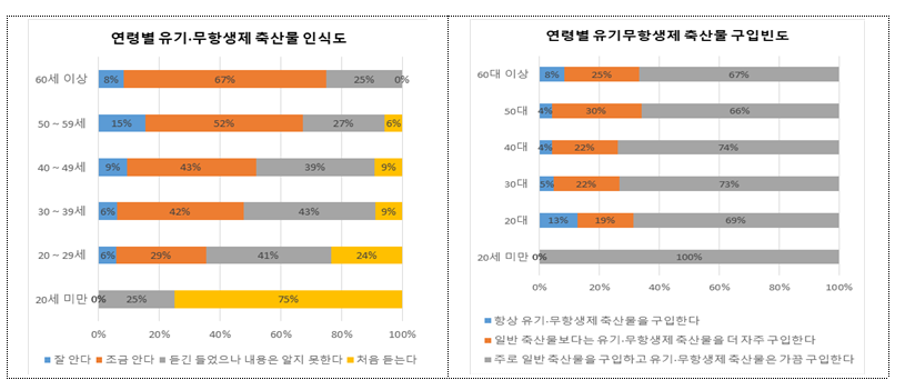 ㅇ 유기‧무항생제 축산물 생산농가의 애로사항은, “직불금 등 지원 부족”이 약 30%로 가장 높았으며, “사료 등 생산비 증가”, “인증절차의 복잡성” 등이 그 다음을 차지하였다. <4> 소비자 인식 조사 □ (인지도) 유기·무항생제 축산물에 대해 “어느 정도 알고 있다”고 응답한 소비자는 53% 수준이었으며 “정확히 알지 못한다”는 소비자도 47% 정도 차지하는 것으로 조사되었다. ㅇ “어느 정도 알고 있다”고 응답한 소비자의 연령대별 비중을 살펴보면, 60대 이상이 75.0%, 50대가 67.3%, 40대가 51.9%, 30대가 47.8%순으로, 연령대가 높을수록 인지도가 높은 것으로 조사되어, 젊은 층을 대상으로 유기·무항생제 축산물에 대한 홍보가 필요한 것으로 나타났다. □ (구매패턴 및 이유) 유기·무항생제 축산물의 주요 구입처는 접근성이 용이한 ‘대형마트’가 44.2%로 가장 높았으며, ‘친환경전문점(16.5%), ‘생협(15.2%)’ 순으로 조사되었다. ㅇ (구입빈도) “주로 일반 축산물을 구입하고 가끔 유기‧무항생제 축산물을 구입한다”라는 응답이 71.4%로 가장 높게 나타났으며, “일반 축산물보다 더 자주 구입한다”와 “항상 구입한다”는 적극적 구매층도 각각 23.5%, 5.1%로 나타났다. ㅇ (구매 만족도) 유기‧무항생제 축산물을 구매한 후 87.8%가 ”만족한다“고 응답하였고, 11.7%는 비싼 가격 등의 이유로 ”만족하지 않는다“고 응답하였다. ㅇ (구입이유) 유기·무항생제 축산물을 구입하는 이유로는 “건강을 위해”라는 응답이 40.8%로 가장 높게 나타났고, “안전하기 때문에”가 38.1%, “환경을 생각해서”가 7.2%로 조사되었다. □ (시사점) 유기·무항생제 축산물의 생산측면에서, 유기는 우유, 무항생제는 계란, 닭고기 등 특정 품목에 편중되는 등 품목 간 생산 불균형이 심한 상황이므로, 품목별 생산 여건과 애로사항을 면밀히 분석하여 생산기반을 확충하는 방안을 마련할 필요가 있는 것으로 파악되었다. ㅇ 유기·무항생제 축산물의 유통측면에서, 생협 및 친환경전문점을 통한 매출액 비중이 높으나, 전국 유통망을 갖춘 슈퍼마켓(SSM) 및 대형마트의 매출액도 증가하고 있으며, 코로나 19 이후 마켓컬리 등 온라인 유통업체의 매출액도 증가 추세이므로, 품목별 특성에 맞춰 최적의 유통채널을 확보할 수 있도록 전략적인 지원이 필요한 것으로 파악되었다. ㅇ 유기‧무항생제 축산물의 소비측면에서, 소비자 인지도는 아직 낮은 수준(53.4%)이므로, 소비자가 유기‧무항생제 축산물의 가치를 이해하고 구매할 수 있도록 “유기‧무항생제 축산물에 대한 가치 홍보”를 강화하고, 연령대별로 차별화된 홍보전략을 수립할 필요가 있는 것으로 파악되었다. □ 농식품부 정경석 축산환경자원과장은 이번 실태조사 결과를 토대로 정책의 미비점을 보완하고, 유기‧무항생제 축산물의 생산‧유통‧소비를 활성화할 수 있는 방안을 지속적으로 모색해 나갈 계획이라고 밝혔다. ㅇ 또한, 금년에 처음 실시한 유기‧무항생제 축산물의 생산‧유통‧소비 실태조사를 매년 실시하고, 유기‧무항생제 축산 활성화를 위해 현장의 목소리 및 시장 트렌드를 정책에 신속히 반영해 나갈 계획이라고 밝혔다. [출처: 농림축산식품부 보도자료 2020. 12. 18.]