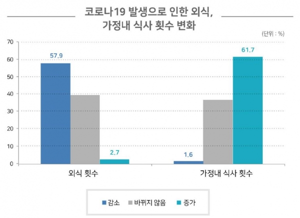코로나19 여파 국민들 ‘식품소비행태’ 변화 가져와 외식 횟수↓ 집밥 비중↑…온라인 식품 구입 증가 소셜커머스 등 비중 늘어, 종식 이후도 변화 없을 듯 올해 코로나19 발생으로 국민들의 식품소비행태가 변화한 것으로 나타났는데, 특히 국민들은 외식 횟수를 줄이고 가정 내 식사 횟수를 늘린 것으로 조사됐다. 지난 18일 한국농촌경제연구원(KREI)이 온라인으로 개최한 ‘2020 식품소비행태조사 결과발표대회’에서 이 같은 결과가 발표됐다.