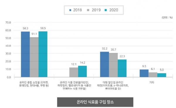 이 결과에 따르면 ‘코로나19 발생으로 외식, 가정 내 식사 횟수 변화’를 묻는 질문에 응답자 57.9%가 외식 횟수를 감소했다고 답변했으며, 반면 가정 내 식사 횟수가 증가했다는 응답이 61.7%가 나와 코로나 영향으로 집에서 식사를 하는 비중이 커진 것으로 나타났다. 여기에 사회적 거리두기 2.5단계에서 식품소비 변화를 5점 만점 기준으로 묻는 질문에 가정 내 신선식품 소비(3.37), 가정 내 가공식품 소비(3.34)로 나타났지만 음식점은 2.29점이 나와 코로나 확산을 방지하기 위해 국민들이 가정에서 식사를 하는 것으로 조사됐다. 이런 식품소비행태 변화는 식품 구입 행태에도 영향을 미쳐 온라인으로 식품을 구입하는 비중이 높게 나타났다. 지난 2018년 0.3%의 가구만이 식품을 주로 구입하는 장소로 ‘온라인’ 채널을 꼽았는데, 이 비중이 올해는 3.5%까지 증가했다. 이는 코로나19로 인해 외출을 최대한 자제하고 집밥이 늘면서 온라인을 통한 식품 구입이 증가한 것으로 풀이된다. 이처럼 인터넷으로 식품을 구입하는 가구의 비중이 지속적으로 증가하고 있는데, 지난해에는 30.7%가 1달에 1회 이상 인터넷으로 식품을 구입한다고 응답했으며, 올해에는 37.9%로 크게 증가했다.