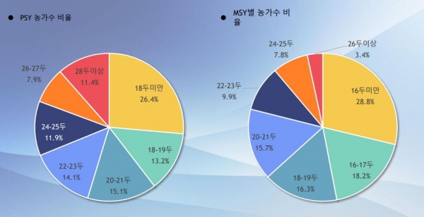 한돈협회가 최근 발간한 2019년도 한돈팜스 전산 성적 보고서에 따르면 2019년 MSY 성적별 농가수 비율을 분석한 결과 △26두 이상=3.4% △24~25두=7.8% △22~23두=9.91% △20~21두=15.7% △18~19두=16.3% △16~17두=18.2% △16두 미만=28.8% 등으로 나타났다. 즉 국내 약 절반의 농가들이 MSY 18두 미만으로 나타났으며, 국제 경쟁력을 가진 MSY 22두 이상 농가 비율은 21.1%에 불과했다.
