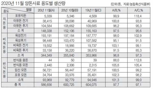특히 모돈 두수 감소세가 더 컸던 만큼 양돈사료량에도 반영됐다. 11월말 용도별 사료량을 보면 자돈용이 163만톤, 비육돈용이 359만톤으로 일년전보다 각각 2.6%, 0.3% 많았던데 비해 번식돈용은 1054천톤으로 전년 대비 0.5% 줄었다.