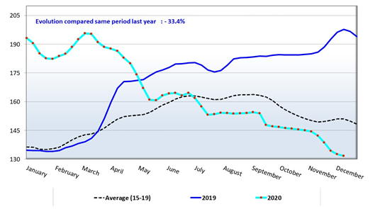 ▲ 19~20년 미국 돼지도축 및 돈가 추이 ■EU, 우려가 현실로=중국의 돼지고기 수입이 픅증하면서 가장 수해를 입은 나라는 EU였다. 지난해부터 대 중국 수출이 급증하기 시작하면서 중국 수입 돈육 가운데 최대 비중을 차지하는 EU의 돼지 값도 뛰기 시작했다. 중국의 수입이 올해 최고치를 기록하면서 EU 돼지 값도 고공행진했다. 하지만 호시절은 3월 코로나 팬데믹 시작으로 막을 내렸다. 3월 평균 돈가는 191유로(100㎏)로 전년 동월 대비 35% 가량 높았지만 11월 중순 현재 지난해 동기 대비 28.7% 낮은 133.8유로까지 떨어졌다. EU 역시 코로나가 소비, 특히 외식 소비를 위축시키면서 수출 호조에도 돼지 값이 하락하는 주된 원인이 됐다. 또한 EU도 돼지고기 가공 작업장 내 코로나 감염이 공급 불안을 초래했다. 그런데 불행은 여기서 그치지 않았다. 그동안 EU 양돈업계가 지속적으로 우려해온 ASF의 확산이 현실화된 때문이다. 폴란드에서는 독일 국경 인접지역에서 올해 ASF가 다발, 독일로의 전파 가능성이 지속적으로 제기됐으며 양국이 국경 울타리 설치 등 독일로의 유입을 막기 위한 노력도 기울여왔다. 그러나 독일 내 폴란드 인접지역인 브란덴부르크에서 지난 9월 처음으로 ASF 감염 야생 멧돼지 폐사체가 확인됐다. 이에 EU 내에서도 스페인 다음으로 수출물량이 많았던 독일은 중국 등 EU 이외 국가로의 수출이 중단됐다. 그 여파는 독일이 가장 크게 받고 있지만 독일이 EU 밖으로 수출하지 못한 돼지고기는 EU 내 공급 물량 증가와 같은 효과를 가져와 EU 전체 돼지 값도 하락 압력을 받고 있다.