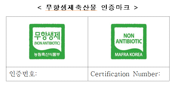 <5> 농가불편 최소화를 위해 기존 인증관리 체계 유지 - (인증표시) 무항생제축산물 인증명칭, 인증마크, 인증번호 등은 소비자의 무항생제 인증에 대한 인지도 및 농가의 포장재 신규 제작에 따른 부담 등을 고려하여 현행대로 유지하였다.