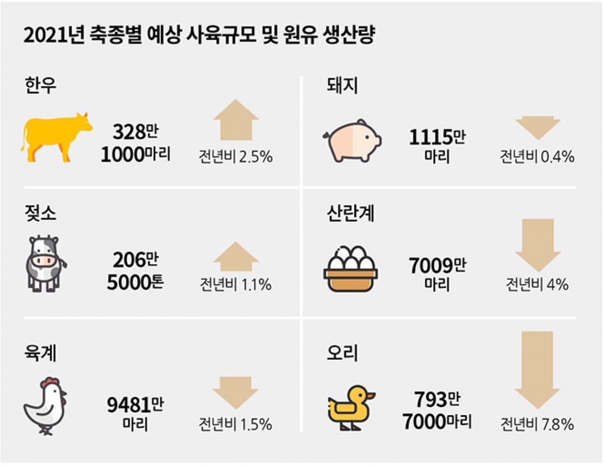 올해 한우를 제외한 돼지·가금 등 주요 가축들의 사육마릿수는 줄어들 전망이다. 돼지 사육마릿수는 모돈 감소의 영향으로 2020년 보다 0.4% 줄어든 1115만 마리, 살처분과 병아리 입식 감소 등의 영향을 받은 산란계 사육마릿수도 4% 감소한 7009만 마리로 예상된다. 종계 입식이 감소한 육계 사육마릿수와 종오리 입식숫자가 줄어든 오리 사육마릿수는 지난해 보다 각각 1.5%, 7.8% 감소할 것으로 보인다. 원유 생산량도 마리당 산유량 감소 등으로 1.1% 줄어들 것으로 예측되지만 가격 상승으로 번식 의향이 높은 한우 사육마릿수는 지난해 보다 2.5% 증가한 3281000두로 예상된다.
