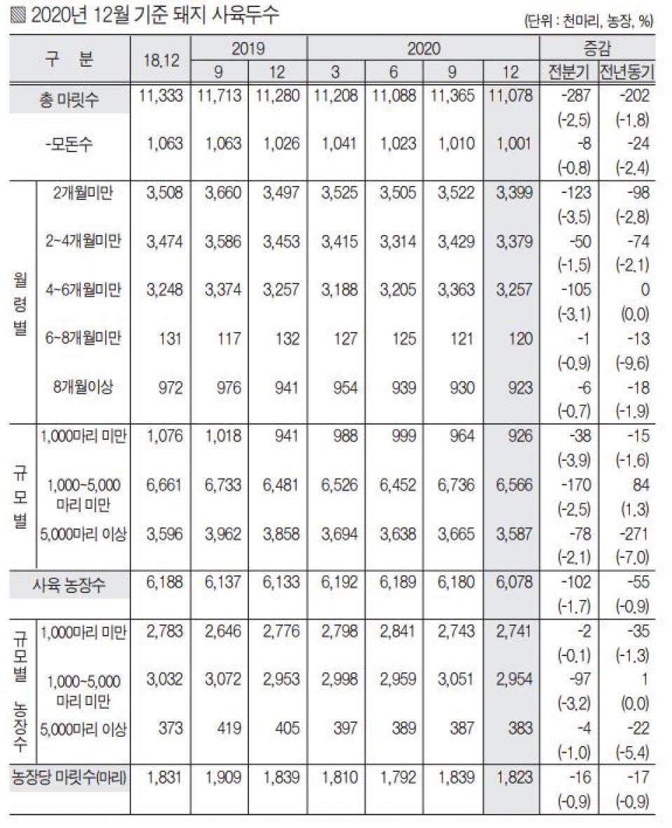지난 21일 통계청에 따르면 12월 기준 돼지 사육두수는 11078천마리로 전분기보다 2.5% 줄었으며 전년 동월 대비로도 1.8% 적어 6월부터 3분기째 전년 대비 감소세를 이어갔다. 모돈은 더 뚜렷한 감소세를 보였다. 12월 기준 모돈 두수는 1001천마리로 1912(1024천마리)보다 2.4%가 적었다. 일년 사이 전체 돼지 사육두수가 202천마리 감소한 가운데 이 중 모돈이 10%가 넘는 24천마리 준 것이다.