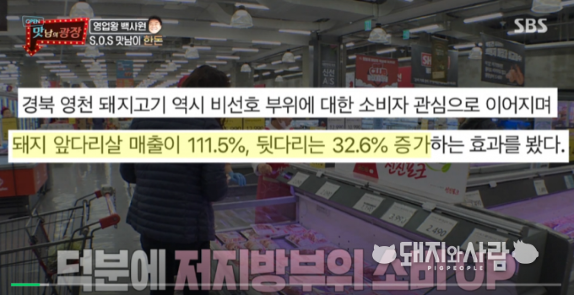맛남의 광장은 경북 '영천 휴게소' 편을 통해 한돈 비선호 부위에 대한 소비자 관심으로 돼지 앞다릿살 매출이 111.5%, 뒷다리는 32.6% 증가하는 효과를 보았다고 방송했습니다.