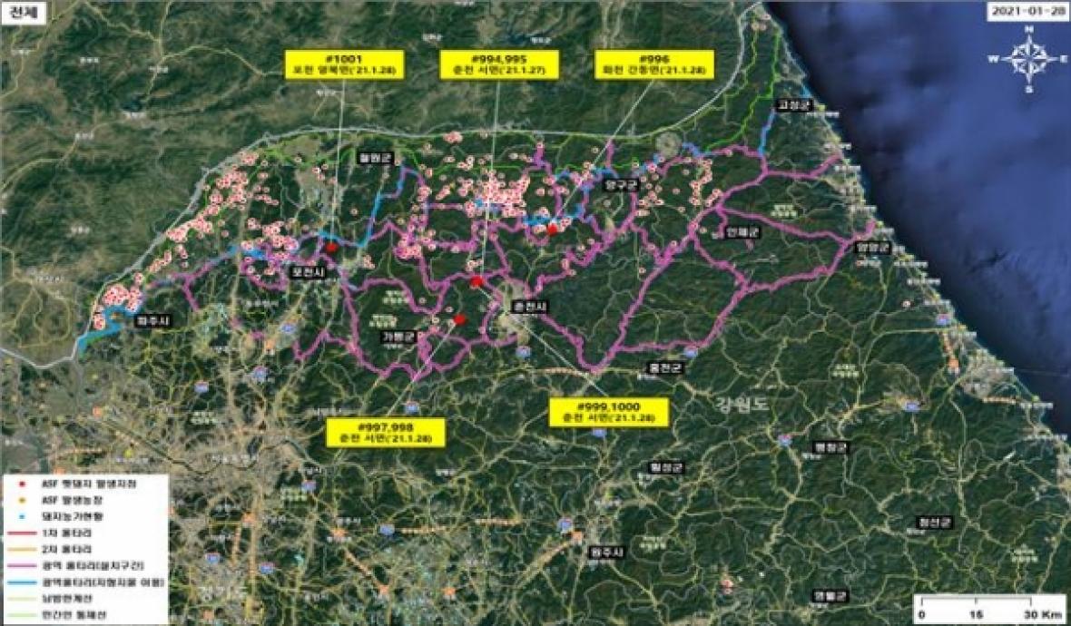 이로써 지난달 28일까지 전국적으로 야생멧돼지에서의 ASF 발생건수는 총 11건으로 발생 지역별로 살펴보면 경기도=연천 324, 파주 98, 포천 38, 가평 12강원도=화천 353, 인제 47, 춘천 40, 양구 36, 철원 34, 영월 8, 양양 7, 고성 4건 등이다.
