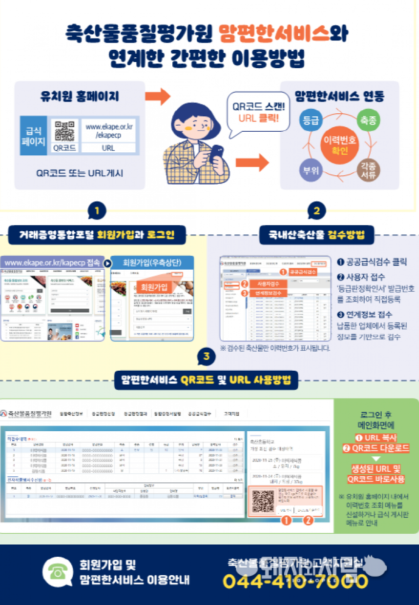 축산물품질평가원(원장 장승진, 이하 축평원)맘편한서비스'를 통해 학교와 유치원 홈페이지에서 학교급식용 축산물의 이력번호를 조회할 수 있도록 지원한다고 밝혔습니다.