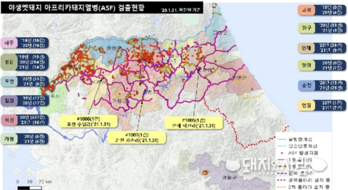 지난 31일 강원도 춘천서 또 다시 광역울타리 밖에서 ASF 감염멧돼지가 뒤늦게 확인되었습니다. 발견지점은 강원도 홍천과 경기도 양평과 불과 10~20km 내 가까운 거리여서 추가 확산 가능성이 높습니다.