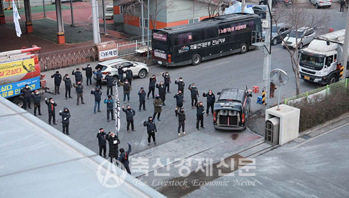민주노총 공공운수노조 화물연대가 선진 군산공장 정문을 봉쇄하고 며칠째 사료차량 출입을 통제하면서, 배합사료를 제때 공급받지 못한 축산농장들의 피해가 우려되고 있다.