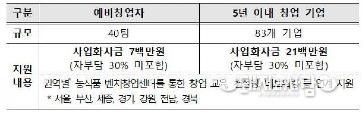 농식품 벤처육성 지원사업 모집 규모 및 지원 내용@농식품부