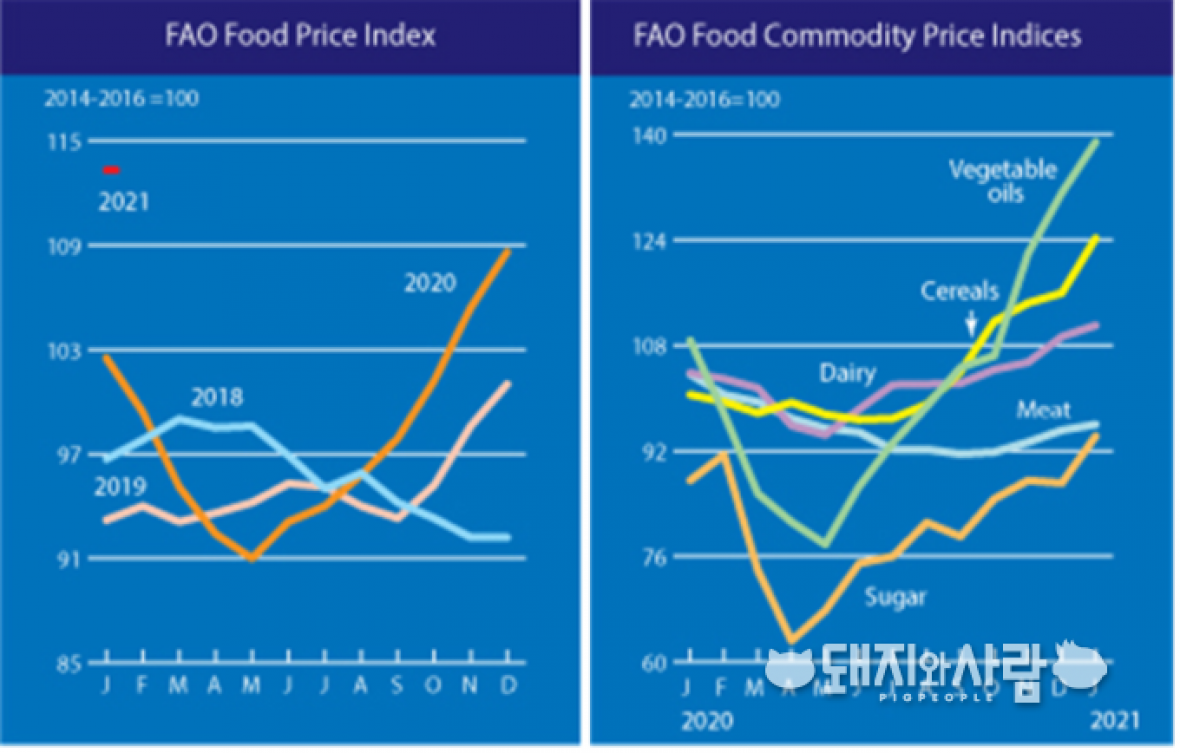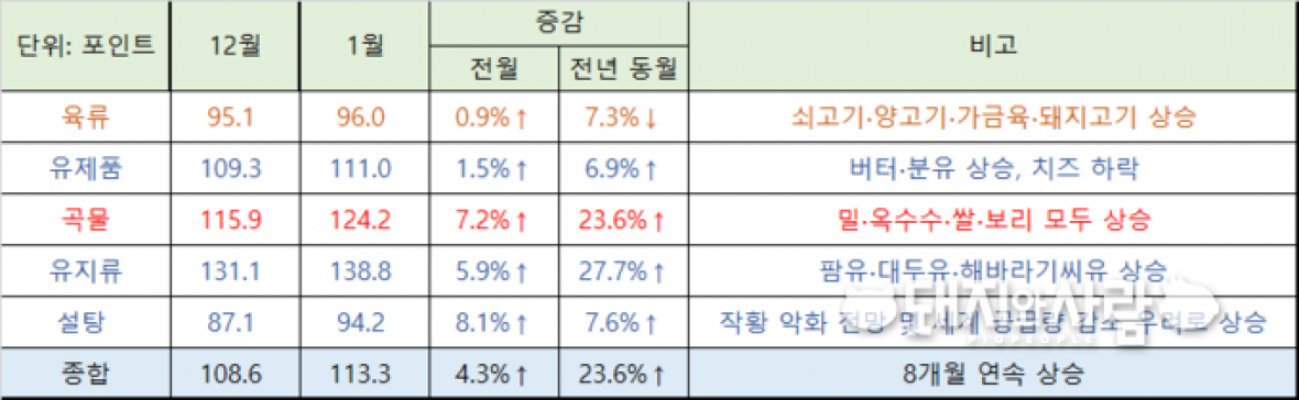 유엔식량농업기구(FAO)에 따르면 1월 세계식량가격지수는 전월(108.6포인트)보다 4.3% 상승한 113.3포인트를 기록한 것으로 나타났습니다. 지난해 5월 이후 8개월 연속 상승입니다. 육류를 비롯해 유제품, 곡물, 유지류, 설탕 가격 모두가 오른 결과입니다.